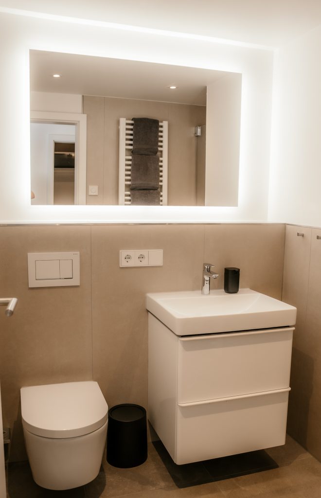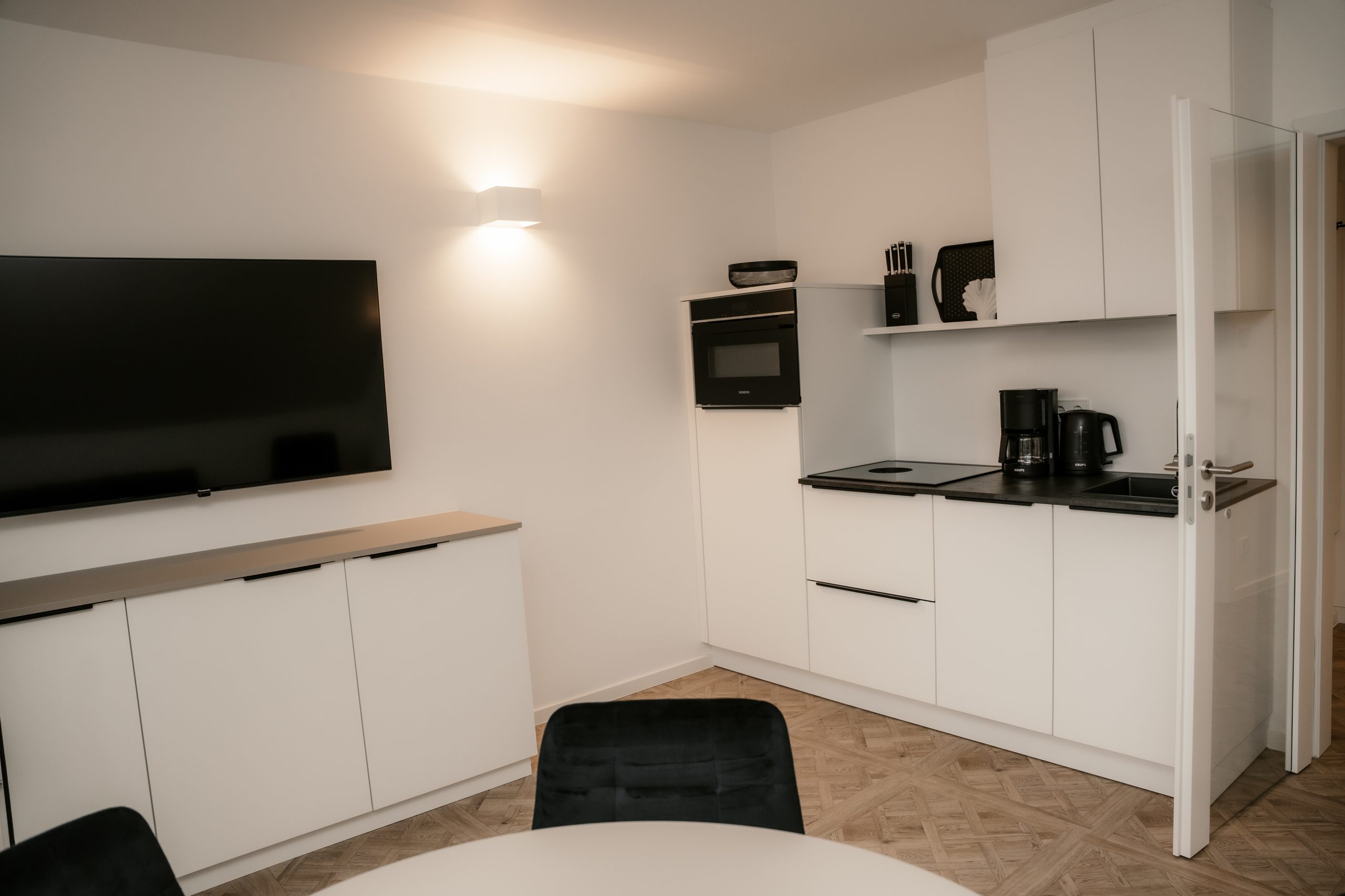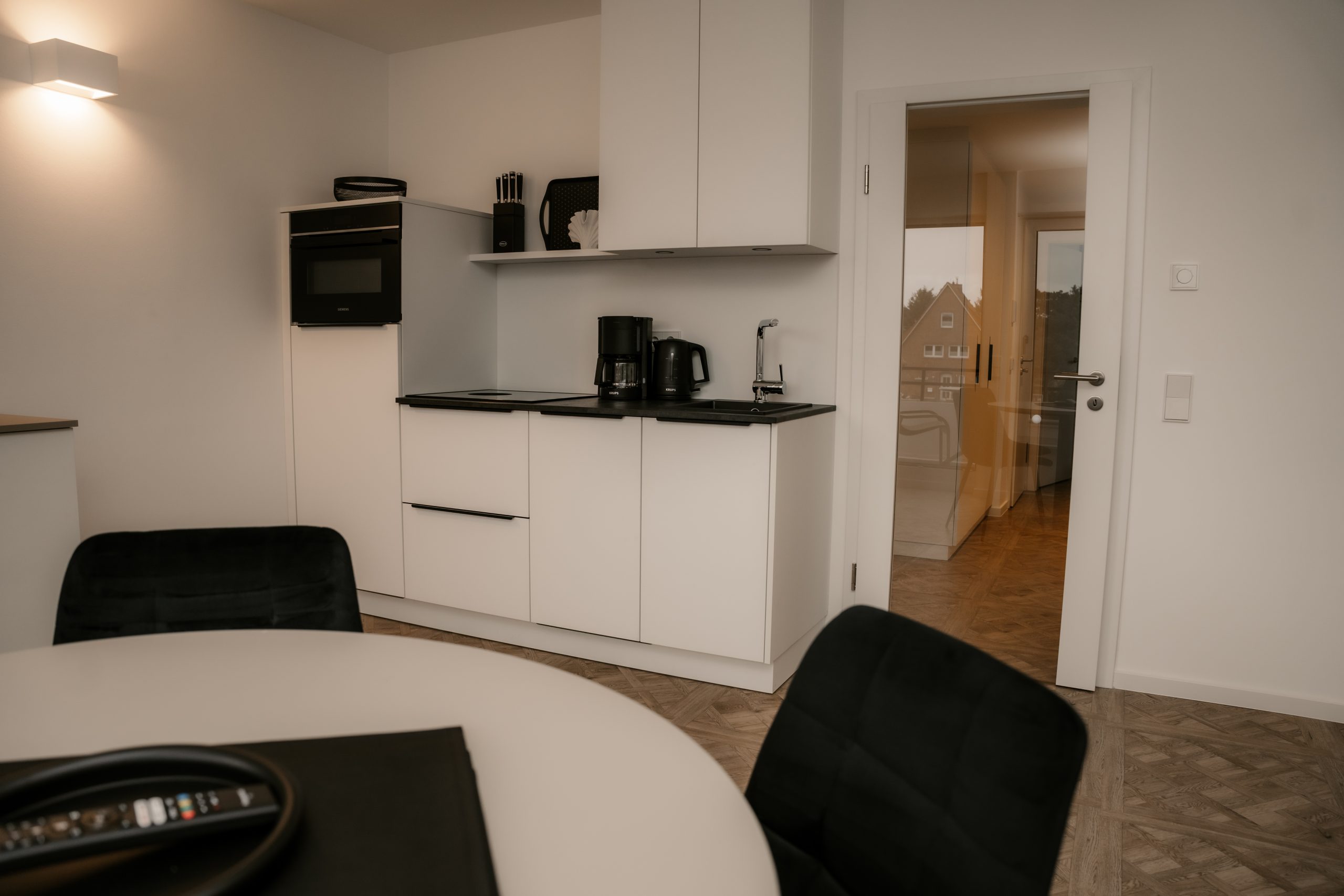 Die Küche ist modern und voll ausgestattet – mit Spülmaschine, Backofen, Kaffeemaschine und allem, was man für den täglichen Komfort braucht. Das Bad bietet eine ebenerdige Dusche, Handtücher und Föhn sind inklusive.