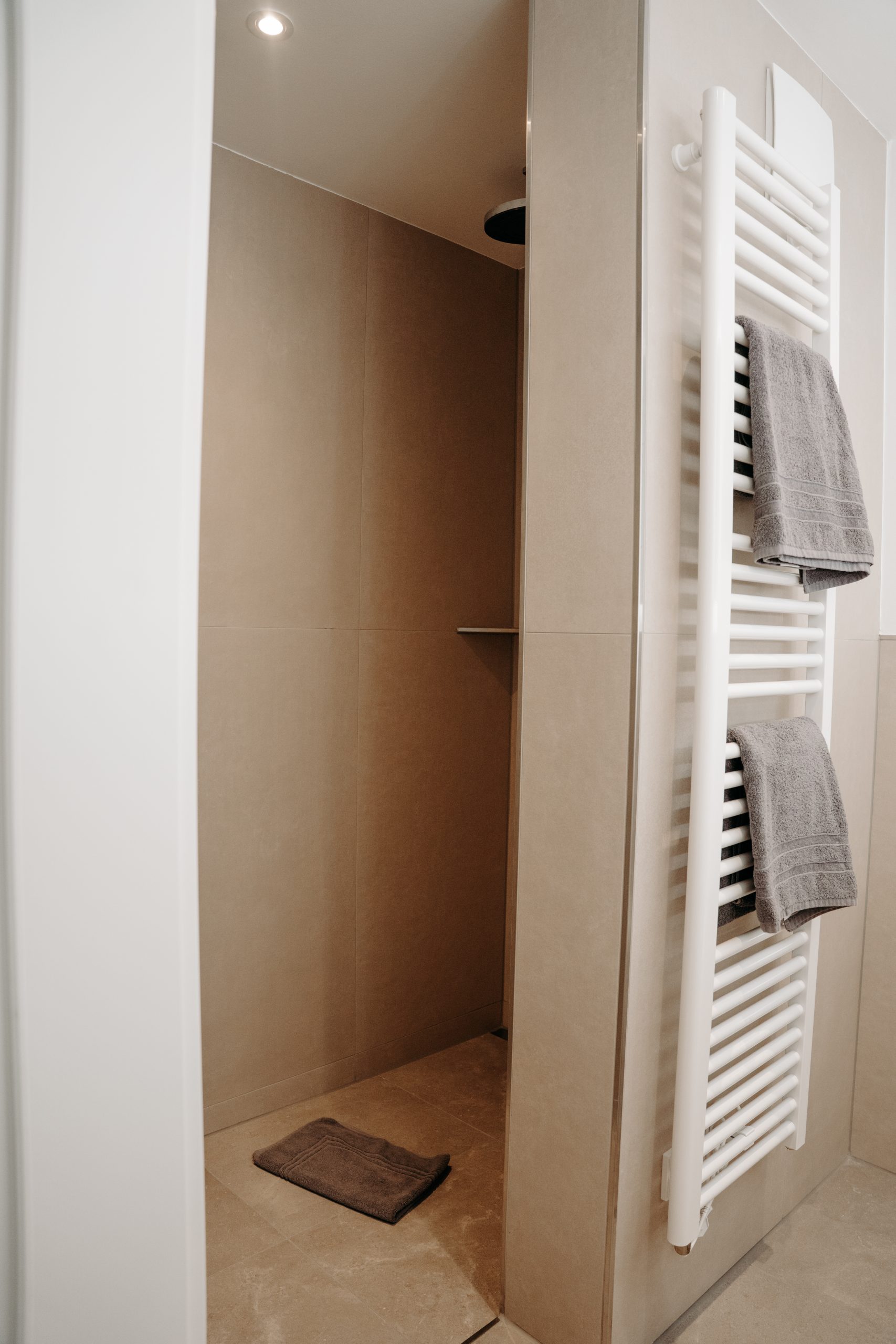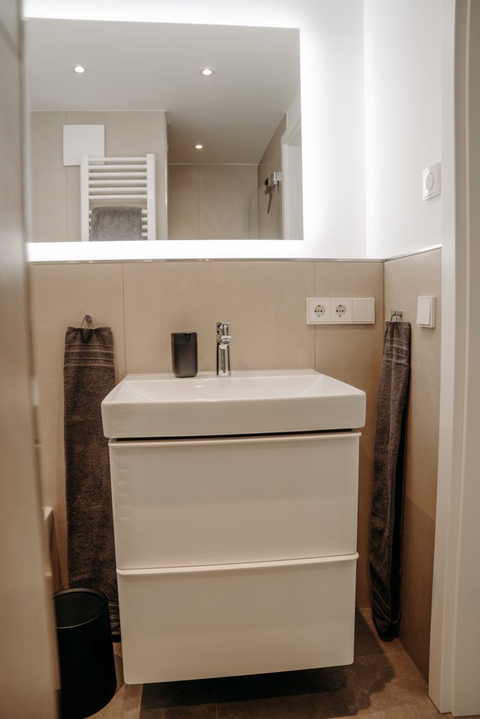• Zwei moderne Duschbäder mit Handtüchern & Föhn