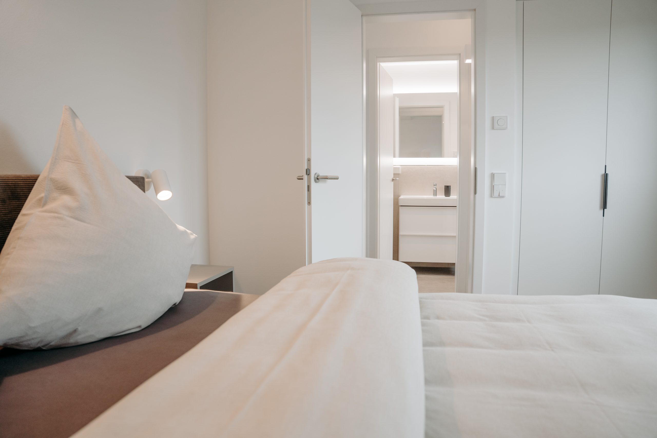 Das Apartment verfügt über drei separate Schlafzimmer, alle mit komfortablen Doppelbetten ausgestattet. Zwei moderne Badezimmer mit ebenerdiger Dusche sorgen für zusätzlichen Komfort. Der helle Wohnbereich mit gemütlicher Sitzecke und Flachbild-TV lädt zum Entspannen ein.
