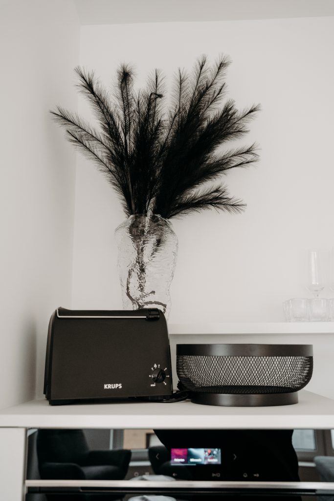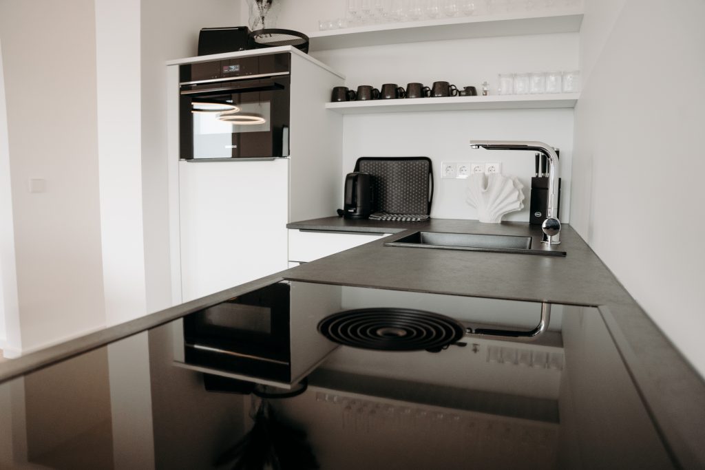 Die Küche ist komplett ausgestattet – mit Spülmaschine, Backofen, Kaffeemaschine und allem, was man braucht, um gemeinsam zu kochen und zu genießen.