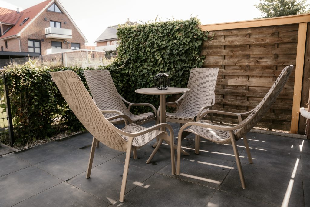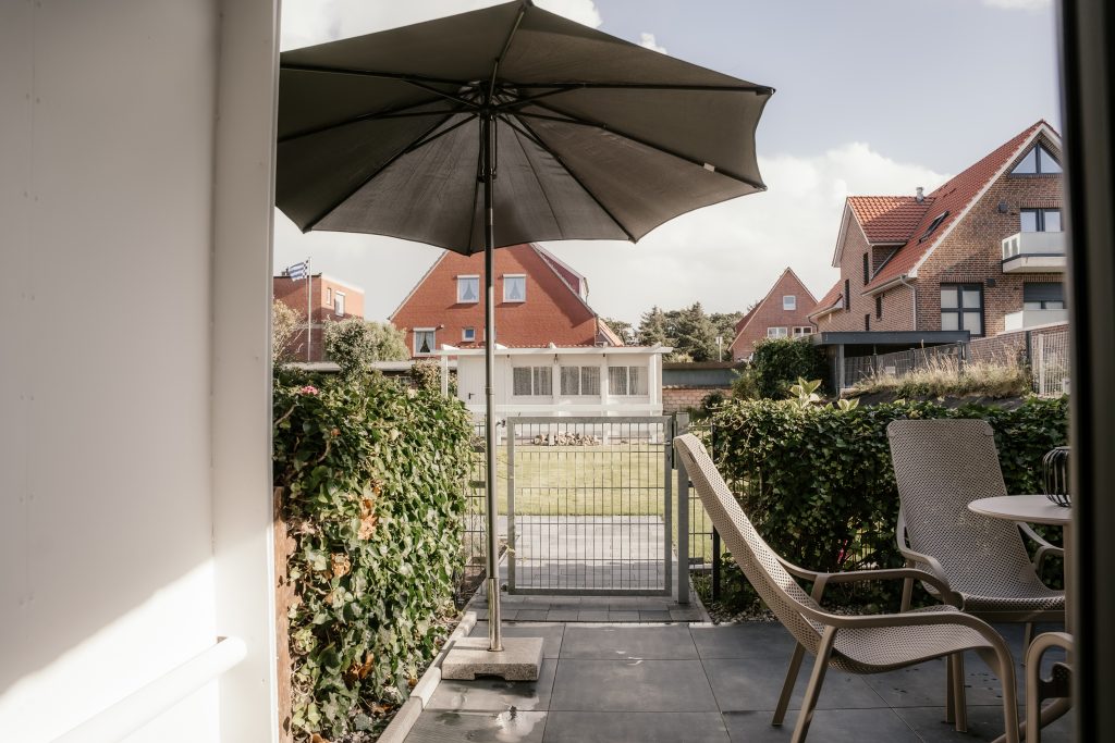 Das separate Schlafzimmer mit Doppelbett sorgt für erholsamen Schlaf, während im hellen Wohnzimmer ein Schlafsofa zusätzlichen Platz und Gemütlichkeit bietet. Die große Terrasse mit Gartenblick lädt zum Frühstück in der Sonne oder zum entspannten Abend bei Meeresluft ein.